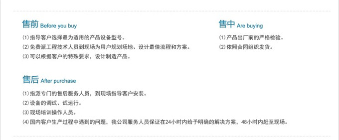 13.關于客服:如您有意購買設備,請及時聯(lián)系我方負責人,在線或者電話溝通,詢問需購買的設備的尺寸、產量及注意問題等,以方便我們向您推薦合適的設備,減少和避免貴方購買設備時造成的成本浪費,長期持續(xù)地為您節(jié)約成本、提升產品品質。